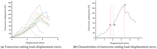 Figure 9 shows the results of the transverse cutting test of jujube bark, and the average maximum cutting force was 118.2 N. It can be seen from Figure 9a that the deformation of the samples during transverse cutting was small. As shown in Figure 9b (average transverse cutting load), the yield stage (approximately from A to B) was short. When the cutting force was achieved at point C (the jujube bark strength limit point), the bark was cut. The average cutting strength of the jujube bark was calculated to be 9.8 MPa.