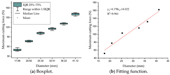 The boxplot and data fitting line of the maximum transverse cutting load–displacement of jujube bark were drawn, as Figure 10 shows. It can be seen from the boxplot (Figure 10a) that the IQR was small and there was no abnormal value, indicating that the data of each group of tests were relatively centralized. That is, the mechanical properties of the transverse cutting of jujube bark were stable under the same natural state. According to the data fitting line (Figure 10b), the maximum transverse cutting load of jujube bark was positively correlated with its corresponding trunk diameter. Furthermore, the determination coefficient R2 was 0.961, indicating that the fitted function had a high degree of fitting to the actual data. The fitting function is shown in Equation (10).