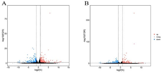 Volcano plots of differentially expressed genes (DEG). (A) Cry1F-resistant vs. susceptible O. furnacalis. (B) Cry1Ie-resistant vs. susceptible O. furnacalis. The scattered dots in the figure indicate each gene: red indicates that the gene is up-regulated, blue indicates that the gene is down-regulated and gray genes indicate no differential expression.