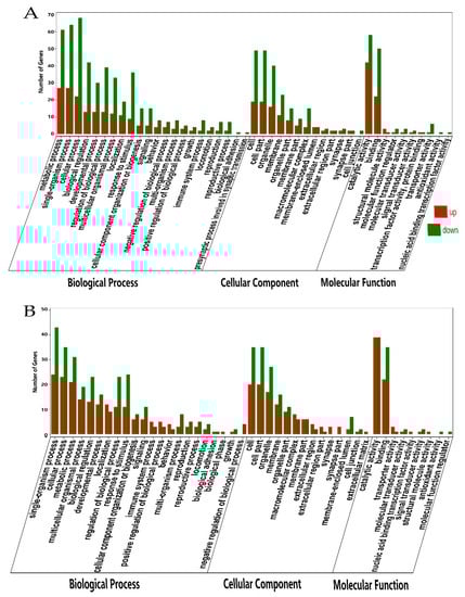 Gene ontology (GO) classification of the differentially expression genes in different ACB strains. (A) ACB-FR vs. ACB-BtS; (B) ACB-IeR vs. ACB-BtS. The abscissa is the second level GO term, the ordinate is the number of genes in the term, red column indicates up-regulation, and green column indicates down-regulation.