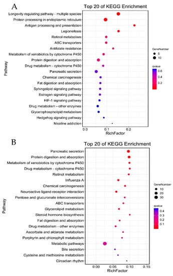 A total of 130 candidate genes with pathway annotation were allocated to reference pathways in KEGG when ACB-FR was compared with ACB-BtS. In the result, 15 pathways with p ≤ 0.05 (Supplementary Materials: Table S4) were enriched, including “Longevity regulating pathway-multiple species” and “Protein processing in endoplasmic reticulum”, which had the lowest p-value. The top 20 most-enriched pathways were shown in Figure 3A. However, comparing ACB-IeR with ACB-BtS, 94 candidate genes with pathway annotations were assigned to the reference pathways in KEGG, and 18 pathways were enriched with p ≤ 0.05 (Supplementary Materials: Table S4), including those with the lowest p-value “Pancreatic secretion” and “Protein digestion and absorption”. The top 20 most-enriched pathways were shown in Figure 3B.