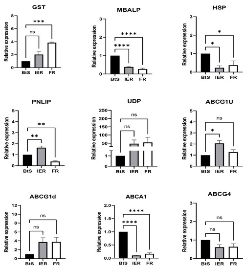 RT-qPCR results of differentially expressed genes. Three biological replicates of each strain of ACB-BtS, ACB-FR and ACB-IeR were performed in three technical replicates. The height of the bar graph represents the average of 2−∆∆CT values. The significance threshold is set to p ≤ 0.05, “ns” indicates that the difference is not significant, “*” indicates the difference is significant, and the number of “*” indicates the degree of significance.
