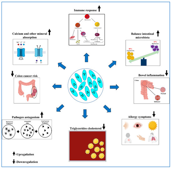 Administration of probiotics has shown increased effect in the levels of immunoglobulins such as M and A along with the increased levels of total antioxidant capacity in serum [29]. Probiotic microbes also have the ability to balance the immune response in the host by increasing the number of anti-inflammatory agents such as IL-10 and TGF-β [30]. Literature also shows that the administration of Lactobacillus rhamnosus improves epidermal growth in the intestine leading to the intestinal epithelial apoptosis reduction, which in turn helps to fight against GI tract diseases [31].
