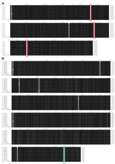 Multiple alignment of CCD7 genes (A) and proteins (B) in different wheat varieties. The alignment was generated in the Lasergene software package MegAlign Version 7. The red boxes indicate the three sites of point mutation within the cloned wheat sequences; the green box indicate the amino acid of the third mutation point in the cloned wheat sequences.