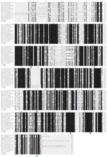 The CCD7-B gene has an open reading frame of 1884 bp, encoding 627 amino acid residues with a molecular weight of 69.8 kDa and a theoretical isoelectric point of 9.4. Analysis of the conserved domain showed that the CCD7-B protein shares a conserved domain with the retinal pigment epithelial membrane receptor (RPE65) superfamily, which is a member of the carotenoid cleavage dioxygenase (CCD) protein family in mammals. Sequence alignment of CCD7 proteins (Figure 2) showed that wheat CCD7-B is similar to the CCD7 proteins of other monocotyledonous and dicotyledonous plants. CCD7-B showed the greatest homology, with homologs in Triticum dicoccoides (99%), Aegilops tauschii (96%), Hordeum vulgare (95%), Brachypodium distachyon (86%), rice and maize (77%), and Sorghum bicolor (75%). However, CCD7-B showed lower similarity with CCD7 proteins of dicotyledons (50–56%). Moreover, CCD7-B proteins have highly conserved residues, including three glutamic acid (Glu) and four histidine (His) residues, which determine the catalytic activity or substrate specificity of CCD proteins.