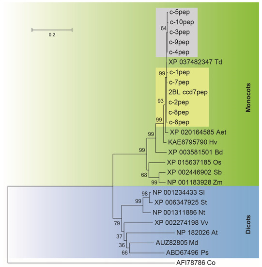 Phylogenetic analysis of CCD7 proteins in different monocots and dicots. The deduced amino acid sequences of CCD7 were aligned using the ClustalW (www.ebi.ac.uk/clustalw, accessed on 10 December 2021) online program. The phylogenetic tree was constructed using MEGA7 by the neighbor joining (NJ) method, with 1000 bootstrap replicates. The tree clusters in two groups, those demarcated by green and blue areas, into monocots and dicots, respectively. The grey and yellow squares indicate the two sub-classes of wheat CCD7-B proteins. Co, Coleochaete orbicularis.