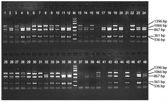 Sequence analysis of the CCD7-B gene revealed two SgrAI cleavage sites in CCD7-B1 and three SgrAI cleavage sites in CCD7-B2. To identify the genotypes of CCD7-B in different wheat varieties, 262 MCC-CNs were used for allelic variation analysis (Table S1). SgrAI enzymatic digestion (Figure 4) and sequence analysis (Figure 5) of the amplified PCR products divided the MCC-CNs into two groups based on cleaved amplified polymorphic sequence (CAPS) markers: 176 MCC-CN wheat genotypes (67%) with cleavage results of 361/867/1396 bp were CCD7-B1, whereas 86 MCC-CN wheat genotypes (33%) with values of 336/361/867/1066 bp were CCD7-B2. The mean number of tillers of CCD7-B1 wheat varieties was 9.6, while the mean number of tillers of CCD7-B2 wheat varieties was 8.4, indicating that CCD7-B1 was a better allelic variation than CCD7-B2 for increasing the number of tillers among wheat varieties grown in China.