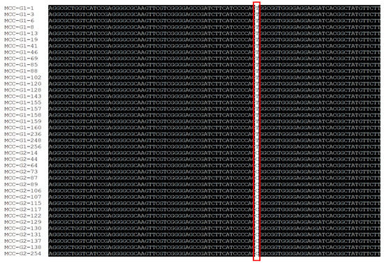 To accelerate the efficient utilization of CCD7-B in modern wheat-breeding programs, molecular markers need to be developed for molecular-assisted selection. The CAPS marker, which is also known as the PCR-RFLP marker [52], has been frequently used for genotyping, map-based cloning, and molecular genetic studies in plants [53,54,55]. In the present study, only one convenient CAPS maker was developed that could distinguish all the CCD7 sequences, which could accelerate the breeding progress with CCD7. Sequence analysis revealed two and three SgrAI cleavage sites in CCD7-B1 and CCD7-B2, respectively. SgrAI enzymatic digestion results of the amplified PCR products from MCC-CN resources showed two groups based on the CAPS marker. In terms of molecular weight, among 262 MCC-CN wheat varieties, 176 (67%) varieties showed a pattern of 361/867/1396 bp, while 86 (33%) varieties showed a pattern of 336/361/867/1066 bp. The sequences of 40 amplified PCR products sent for sequencing also supported two groups based on nucleotide variations in MCC-CNs (Figure 5). SgrAI enzyme digestion and sequence analysis both indicated sub-classification of the CCD7-B genotype into CCD7-B1 (C/T/T) and CCD7-B2 (G/C/A), showing that this CAPS marker can accurately distinguish point mutations in the CCD7-B gene.