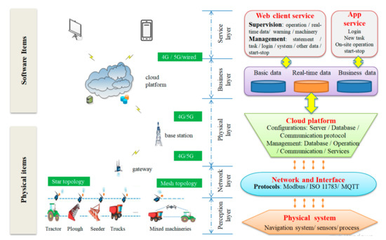 The key part of the proposed AAMMP structure is the cloud layer, which is used to control various agricultural machines and decides all the functionalities of the system. Figure 2 shows the architectural diagram of the AAMMP, which can be classified into two entities: the physical item (or things) and software. The physical item consists of perception and network layers, including embedded devices, sensors, data transmission modules, routers, and gateways. Because all the machines have embedded computing and communication capabilities, they can perceive the environment through a navigation or machine vision system and then interact with each other using direct or indirect communications to ensure high-quality cooperation. Direct communications can be implemented by an ad hoc network such as mesh topology, whereas indirect communication can occur with a mobile gateway or base station through a star topology. For the software, business and service layers mainly concentrate on data management and business control separately. Between the two items, the cloud platform plays the key role of intelligent brain and manager, which can control the physical entities in the background businesses and also manage the upstream data and service applications. Finally, customers and users can monitor and manage agricultural machinery in the whole farm through visiting Web client service or App (Application) service.