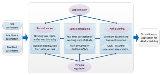 In the AAMMP, task allocation refers to clustering operations at the production scale in accordance with the operation specifications, machinery, time, and other factors. A reasonable operational batch can be formulated by balancing the energy and time consumption. Vehicle scheduling refers to a machinery grouping optimization to minimize the operational time according to the distances between the fields that need to be worked and vehicles capable of carrying out the desired tasks. Usually, the nearest distance method will be adopted to form the machinery team. Path planning involves how the chosen machinery team will work in each field, and the optimization goal is also the minimum time necessary based on the field area and efficiency of the machinery.
