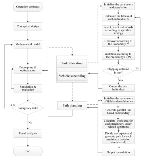 As shown in Figure 1, when an operational task is assigned, its related demands (e.g., machinery assembly, path planning, control scheme, and work efficiency) are parameterized and sent to the cloud platform for further operational scheduling. The static execution solution is generated by the multiple optimization method executed through cloud computing. However, several emergency tasks may emerge due to unpredicted situations during the task processing, including bad weather and equipment malfunctions. For example, a working tractor cooperating with other tractors may be transferred to another field to work, interrupting the previous operational plan and resulting in previous tasks being reconfigured. Therefore, these priorities need to be addressed by a dynamic result generated by coupling the optimization of the previous job and the next urgent task. Thus, the dynamic execution solution will be constrained by the static results because they can directly affect parameters and iterations of the coupling optimization method. After that, by pursuing the balance and stability of the static and dynamic scheduling plan, the control directions can be created and sent to the on-board system of the agriculture machinery through a mobile network.