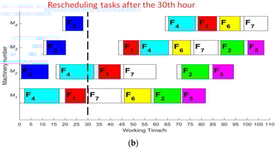 In Figure 5, the colored column indicates the operating time in the fields and the white columns before each colored column indicate the total time, which includes the travel time from the field where the assignment was performed to the field to be worked, and the ready time before operation. The original operational plan for five fields is shown in Figure 5a. When all the machines have been working for 30 h, some new tasks, such as the new tasks in fields 6 and 7, need to be performed using this agricultural machinery. Then, the original assignment is dynamically adjusted and the overall undone tasks are rescheduled, as shown in Figure 5b.