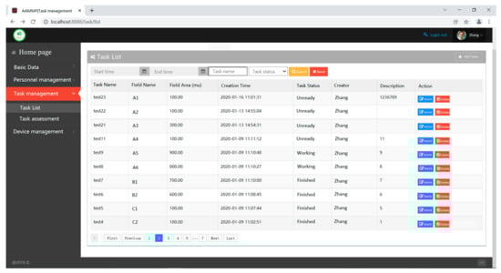 As shown in Figure 6, a demonstrative prototype AAMMP system was developed by integrating and communicating with the hardware devices. It contained a set of application-oriented systems involving an app and a web, as well as a cloud platform management system. The first was developed using J2EE technology architecture and integrated with the proposed decoupling algorithm. The others were designed for system configuration and integration, and their functions include system deployment in the cloud server, database connection, communication protocol designation, and remote control of agricultural machinery. In addition, Aliyun, which is part of Alibaba Co., was selected as the server platform.