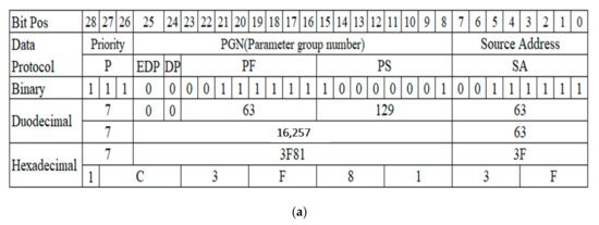 Because of its high reliability and low cost, the Controller-Area-Network (CAN) was used for communication in the chassis systems of the agricultural machines. The ISO 11783 protocol, which includes the CAN 2.0 specifications, and the SAE J1939 protocol have been widely used to transmit data among the ECUs of such chassis systems [34]. To simplify the data processing, we used ISO 11783 based on the CAN bus application layer protocol to transmit data between AAMs and the AAMMP. In the J1939 protocol, the 29-bit identifier of the CAN is physically defined, and the corresponding data definition is formulated. This is implemented and encapsulated by the Protocol Data Unit (PDU). The PDU contains seven sections: priority, retention bit, data page, PDU format, PDU special field, source address, and data field. Thus, the PDU is mainly defined. An example of a data package is present in Figure 7.