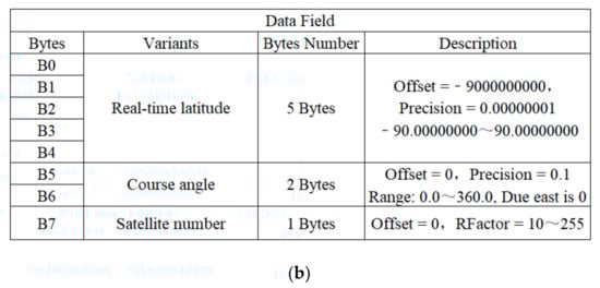 Sample of data package of the proposed protocol. (a) Control field. The PDU (Protocol Data Unit) contains seven sections: priority, retention bit (R), data page (DP), PDU format (PF), PDU special field (PS), source address (SA), and data field. (b) Data field.