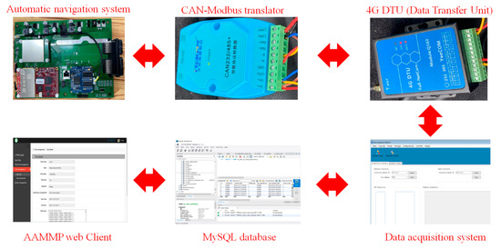 After the basic protocol between the AAM and agricultural machinery was established, the network and communication link were built, as shown in Figure 8. The automatic navigation system was installed in the agricultural machinery, and it was used to control the automatic operation of the machinery by sending directional commands to the on-board motion controller. The CAN-Modbus translator translated the packaged J1939 protocol data to Modbus-style and then sent it to the 4G DTU. Afterwards, the data acquisition system collected the data package from the 4G DTU and translated it into decimal numbers, which were saved to a database. Then, the AAMMP system could edit and maintain these data using the web client or app.