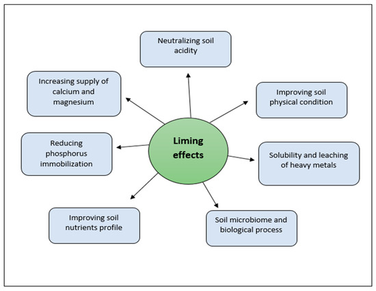 In facing global warming, oil palm cultivations demand the implementation of sustainable, efficient, ecologically friendly management practices. Liming is an essential soil management technique in this context since it helps to maximize the production of oil palm crops growing on acidic soils. Liming is the most commonly utilized long-term technique of soil acidity restoration, and its effectiveness has been well established in the literature [50]. Applying lime at an adequate amount leads to numerous biogeochemical changes in the acidic soil that is favorable in increasing crop yields on acid soils (Figure 1).