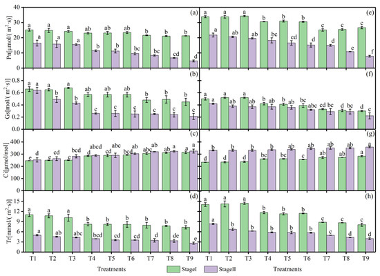 Photosynthetic characteristics of tomato leaves at different growth stages in 2020 (a–d) and 2021 (e–h) under RDI. The bars indicate standard error (±SE) of the mean ((n = 3). The same letters in figure indicate nonsignificant differences between the treatments, whereas different letters indicate a significant difference (p ≤ 0.05).