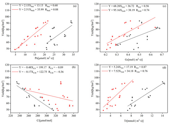Correlation between Pn (a), Ci (b), Gs (c), Tr (d) and yield at different growth stages. The black line shows the correlation between yield and photosynthesis indexes in Stage I. The red line shows the correlation between yield and photosynthesis indexes in Stage II.