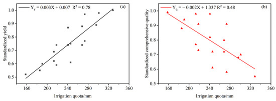 Correlation between the standardized yield (a), quality parameters (b), and irrigation quota. The standardized yield is the ratio of the yield of each treatment to the maximum yield. Standardized comprehensive quality is the average value of the ratio of each quality parameter to the highest quality value.