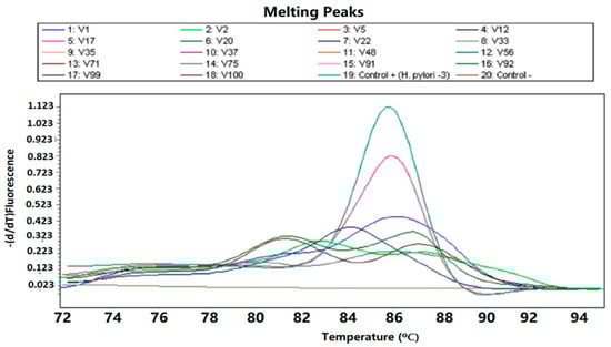 Melting curves obtained for H. pylori vacA gen quantitative detection from raw vegetables, including: curve 19, positive control (Tm 86 °C); curve 15, V91 peak detected in spinach (Tm 85.4 °C); curve 5, V17 peak detected in lettuce (85.5 °C); curve 1, VI peak detected in chard (Tm 86.1 °C).