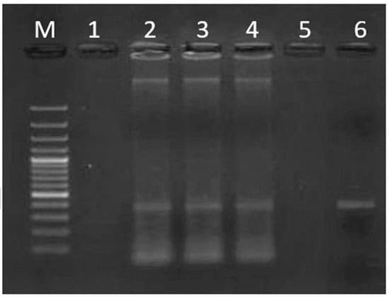 Example of a gel electrophoresis of the amplicons of vacA H. pylori gen generated by means of qPCR. M: Molecular weight marker (100 bp DNA Ladder); lane 1: sample V3, chard; lane 2: sample V20, lettuce; lane 3, sample V2, chard; lane 4, sample V12, spinach; lane 5, sample V6, lettuce; lane 6, positive control H. pylori NCTC 11638.