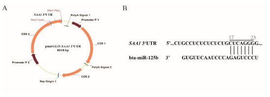 The binding sequence of bta-miR-125a was predicted to be in the 3′ untranslated region (UTR) of the SAA1 mRNA. Thus, the DNA sequence for this region was amplified by PCR, using bovine mammary gland DNAs as templates and a primer pair (pSAA1 3′UTR Forward: 5′-GCTGCCTCTCTCTCTGCTCAG-3′; pSAA1 3′UTR Reverse: 5′-TTTTGTTTGACCCAAATATAGTGAGGATAAAGGT-3′; Sangon, Shanghai, China). The PCR conditions were as follows: 94 °C for 5 min, followed by 35 cycles of 94 °C for 30 s; 60 °C for 30 s; and 72 °C for 45 s; and a final extension at 72 °C for 10 min. The 683 bp PCR products were digested with PmeI and XbaI, and then inserted into the plasmid pmirGLO Dual-Luciferase miRNA Target Expression Vector (PmiRGLO, Promega, Madison, WI, USA), in order to obtain the recombinant plasmid PmiR-SAA1–3′UTR-wild type (WT) (Figure 1A). The seed sequences recognized by miR-125a in the plasmid PmiR-SAA1–3′UTR-wild type (WT) were deleted using a QuikChange site-directed mutagenesis kit (Stratagene, La Jolla, CA, USA) to generate the plasmid PmiR-SAA1–3′UTR-mutant (MUT), which was used as a negative control (Figure 1B). The plasmids were all confirmed by DNA sequencing and used in the luciferase reporter assay.