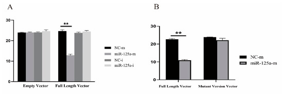 MicroRNAs suppressed the expression of SAA1 by binding to the 3′-UTR target sequence. Luciferase activity in HEK293 cells co-transfected with miRNA mimic, miRNA inhibitor, miRNA control and empty vector for the SAA1 3′-UTR. Luciferase activity was assayed 24 h after transfection. All luciferase values were normalized to Renilla luciferase. Black columns represent the luciferase activity upon co-transfection with miRNA-mimic control. Middle gray columns represent the luciferase activity upon co-transfection with miRNA-inhibitor control. Dark gray columns represent the luciferase activity upon co-transfection with miRNA mimic. Light gray columns represent the luciferase activity upon co-transfection with miRNA inhibitor. (A) represents the luciferase activity of SAA1 after over- or under-expression of miR-125a compared with controls; (B) represents the luciferase activity of SAA1 after transfecting the mutant vector and miR-125a, compared with control. ** Very significant difference between the control and the treatment (p < 0.01).