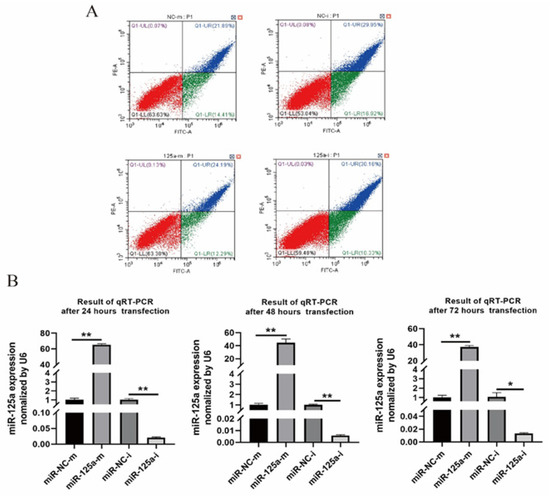(A) After transfection with miR-125a mimic and inhibitor for 72 h, flow cytometry was used to detect the apoptosis rate of MAC-T cells; (B) Results of qRT-PCR. The expression levels of miRNAs at 24, 48 and 72 h after transfection. * Significant difference between the control and the treatment (p < 0.05); ** Very significant difference between the control and the treatment (p < 0.01).