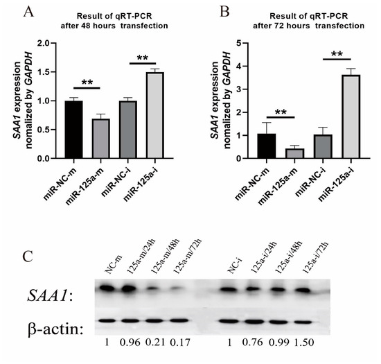 MiR-125a regulates SAA1 expression in dairy cow mammary epithelial (MAC-T) cells. (A) Results of qRT-PCR: the expression of SAA1 at 48 and 72 hours after transfection; (B) Western blotting result map and quantification; PhotoShop was used to calculate the gray values; (C) Western blot of SAA1 and their negative controls using β-actin as a reference control. ** Very significant difference between the control and the treatment (p < 0.01).