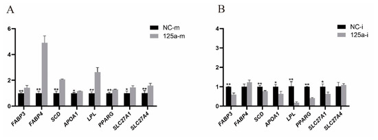 (A) Expression of lipid-related genes after miR-125a-mimic transfection; (B) Expression of lipid-related genes after miR-125a-inhibitor transfection. * Significant difference between the control and the treatment (p < 0.05); ** Very significant difference between the control and the treatment (p < 0.01).