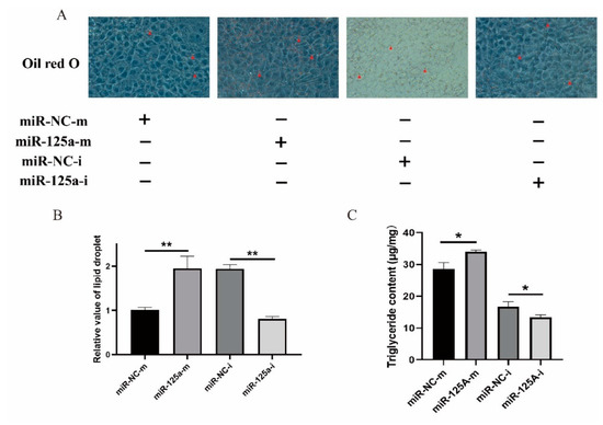 The results of oil red O staining showed that transfection with the miR mimic increased the aggregation of lipid droplets, whereas bta-miR-125a knockdown suppressed the aggregation of lipid droplets (Figure 6A). Using the ImageJ software to analyze the relative content of lipid droplets, we found that the content of lipid droplets in cells transfected with the miR mimic was higher than that in the NC group and in the group transfected with miR inhibitors (Figure 6B). In addition, the triglyceride assay revealed that transfection with miR mimics increased the triglyceride content, while transfection with miR inhibitors had the opposite effect (p < 0.01; Figure 6C).