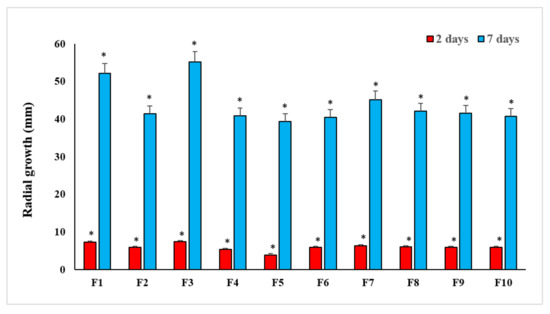 Isolates F 1 and F 2 showed the highest growth rates on a PDA nutrient medium at 25 °C 2 and 15 days after incubation. F1 recorded 7.28 and 7.42 mm, respectively, while F2 displayed 52.12 and 55.19 mm, respectively. Isolates F1 and F3 were classified as quick growing and the other isolates had an average growth rate (F2, F4–F10) (Figure 1).