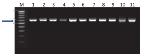 Internal transcribed spacer (ITS) regions of Fusarium oxysporum lycopersici isolates were amplified by polymerase chain reaction using ITS1 and ITS4 primers and the products were separated by agarose gel electrophoresis. M, 100 bp ladder; lane 1, F1 isolate; lane 2, F2 isolate; lane 3, F3 isolate; lane 4, F4 isolate; lane 5, F5 isolate; lane 6, F6 isolate; lane 7, F7 isolate; lane 8, F8 isolate; lane 9, F9 isolate; lane 10, F10 isolate; lane 11, no template control.