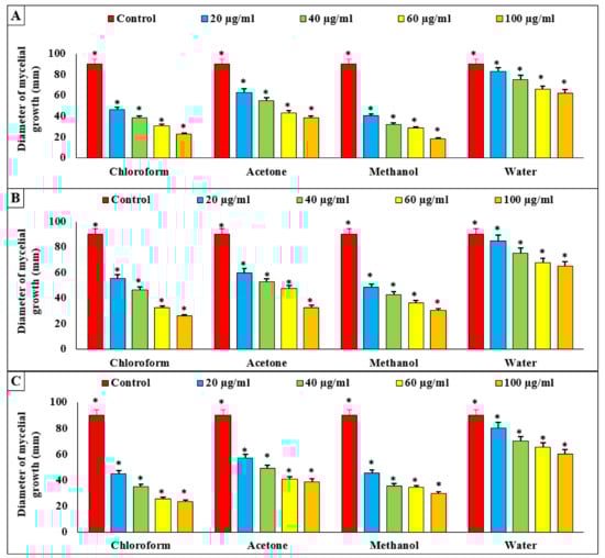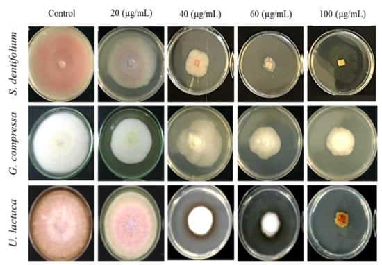 For assessing the antifungal activity of macroalgae extracts, 20, 40, 60, 80, and 100 µg/mL. of each solvent were dispensed into sterilized PDA plates. PDA plates are amended with each of the solvents to prepare the algae extracts; chloroform, acetone, and methanol were used as controls. A 5-mm-diameter circle was then removed from the edges of the vigorously developing fungal colonies and moved to the middle of the medium. In addition, all inoculated plates were stored in an incubator at 25 °C and tested every day until the top of the medium was completely coated with fungus. Next, the radial growth of the fungal pathogen was measured. The hyphal growth inhibitory effect of the extract was determined for each concentration by means of the following formula: % inhibition = (𝑑𝑐 − d𝑡)/𝑑𝑐 × 100, where 𝑑𝑐 is the average increase in control hyphal growth and 𝑑𝑡 is the average increase in growth in treated mycelium [23].