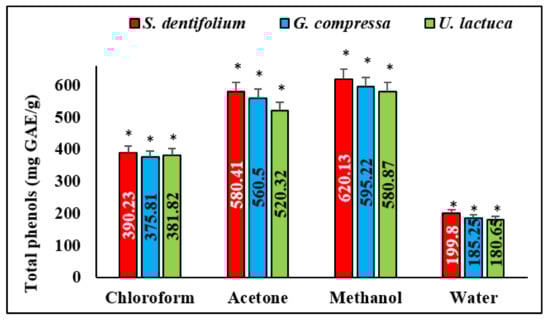 Total phenolic content of S. dentifolium, U. lactuca, and G. compressa extracts. The data are expressed as mg of gallic acid per gm dry extract (highly significant = * p < 0.05, n = 3).