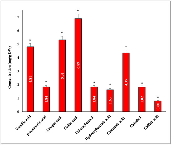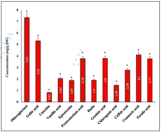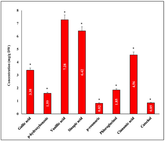 HPLC profile of phenolic compounds in methanol extract of G. compressa (highly significant = * p < 0.05, n = 3).