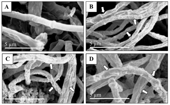 Scanning electron micrographs of FOL treated with U. lactuca, S. dentifolium, and G. compressa extracts (100 µg/mL). The untreated mycelia are well developed and inflated with smooth walls (A). The treated mycelia showed plasmolyzed, distorted, squashed, and collapsed hyphae and some were completely dead (indicated by arrows); U. lactuca (B), S. dentifolium (C), and G. compressa (D). Scale bar = 5.0 µm.