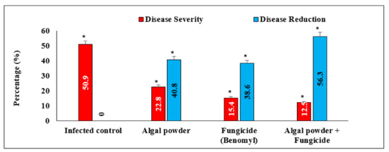 Disease severity of Fusarium wilt (percentage) in tomatoes treated with algal powder of S. dentifolium (at 10% concentration) (highly significant = * p < 0.05, n = 3).