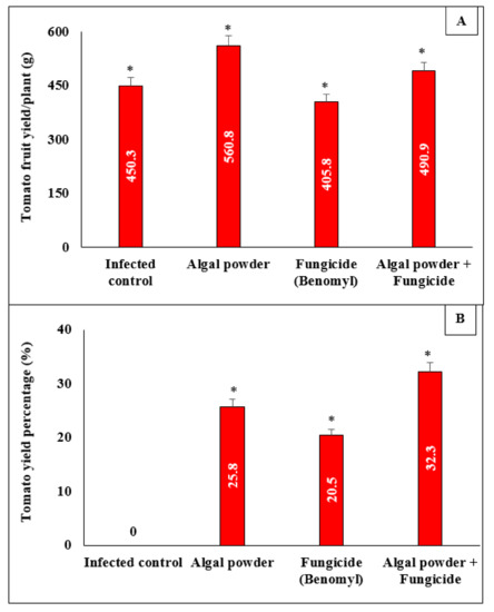 Because S. dentifolium extract had the strongest inhibitory effect on FOL hyphal growth, this algal powder was deemed as a biological control agent for FOL and used in a greenhouse experiment. In this study, autoclaved sterile sandy-loam soil was infested with an inoculum of sorghum grains of 3% (w/w)/kg soil (2–6% colonization of FOL on sorghum grains used as a bait and 3000 CFU g−1 of soil). These infested sorghum grains (autoclaved before infestation) were provided by the Microbiology Laboratory of Damietta University, New Damietta, Egypt). Infested pots were irrigated and set aside for seven days to guarantee pathogen dispersal in the soil before seed sowing. The infested soil was amended with dry algal powder in the ratio 1 g algal powder: 1 kg soil w/w at seed sowing. Ten seeds were sown in each pot; four replicates were used for each treatment. The control treatment was carried out with a chemical fungicide (benomyl) as seed coating (3 g benomyl/kg) seeds before seed sowing. In this experiment, four treatments were evaluated; infected control, algal powder only, fungicide only, and algal powder + fungicide. Pots were kept in the greenhouse until the end of the experiment (duration: 60 days), and the tomato yield was weighted for all treatments. Seeds of tomatoes were obtained from the Agricultural Research Center, Cairo, Egypt. Seeds were surface-sterilized in a 2% sodium hypochlorite solution for 2 min before sowing [25].