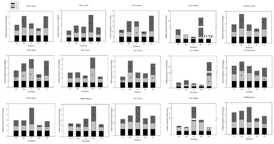 Under salt stress, compatible osmolytes such as proline and glycine betaine are produced and accumulated, a process that is species- and tissue-specific [40]. Compatible osmolytes can minimize water loss in response to short-term osmotic stress and improve cell turgor and expansion in response to long-term osmotic stress (continued growth under salt stress) [128]. Higher transcript levels of CMO in CC and CV rootstocks were recorded for T1 in leaves compared to the other genotypes (Figure 3). Tolerance to salt and temperature stress in rice was improved by the production of a CMO gene from spinach (Spinacia oleracea L.) [129]. Transgenic tobacco plants that overexpress the beet BvCMO gene accumulate GlyBet and have increased resistance to salt (150 mM NaCl) and drought stress [130]. Our results show the early involvement of this gene in leaves for both CC and CV in response to salt stress.