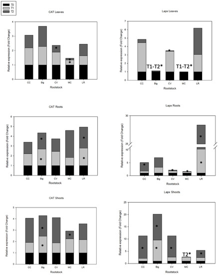 Expression profiles of APX and CAT genes of ‘Hernandina’ clementine (Citrus clementina hort. ex Tanaka) (willowleaf mandarin (C. deliciosa) × sweet orange (C. sinensis (L.) Osbeck)) grafted on 5 citrus rootstocks in response to salt. Big: sour orange (C. aurantium L.); CC: Carrizo citrange (C. sinensis × Poncirus trifoliata (L.) Raf); CV: Volkamer lemon (C. volkameriana V. Ten. & Pasq.); LR: Rangpur lime (C. limonia Osbeck); MC: Cleopatra mandarin (Citrus reshni hort. ex Tanaka). For each combination (rootstock/‘Hernandina’), stacked panels showed gene expression in plant tissue (leaves, shoots, and roots) treated with NaCl (T1: 35 mM NaCl; T2: 70 mM NaCl) relative to untreated samples (T0, only nutrient solution without salt treatment). Relative gene expression was calculated using 2−ΔΔCT method (fold change). * Significant differences for p values < 0.05.