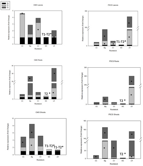 Expression profiles of CMO and P5CS genes of ‘Hernandina’ clementine (Citrus clementina hort. ex Tanaka) (willowleaf mandarin (C. deliciosa) × sweet orange (C. sinensis (L.) Osbeck)) grafted on 5 citrus rootstocks in response to salt stress. Big: sour orange (C. aurantium L.); CC: Carrizo citrange (C. sinensis × Poncirus trifoliata (L.) Raf); CV: Volkamer lemon (C. volkameriana V. Ten. & Pasq.); LR: Rangpur lime (C. limonia Osbeck); MC: Cleopatra mandarin (Citrus reshni hort. ex Tanaka). For each combination (rootstock/’Hernandina’), stacked panels show gene expression in plant tissues (leaves, shoots, and roots) treated with NaCl (T1: 35 mM NaCl; T2: 70 mM NaCl) relative to untreated samples (T0, only nutrient solution without salt treatment). Relative gene expression was calculated using 2−ΔΔCT method (fold change). * Significant differences for p values < 0.05.
