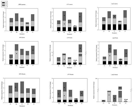 Expression profiles of SPS, LTP, and LEA2 genes in ‘Hernandina’ clementine (Citrus clementina hort. ex Tanaka) (willowleaf mandarin (C. deliciosa) × sweet orange (C. sinensis (L.) Osbeck)) grafted on 5 citrus rootstocks in response to salt. Big: sour orange (C. aurantium L.); CC: Carrizo citrange (C. sinensis × Poncirus trifoliata (L.) Raf); CV: Volkamer lemon (C. volkameriana V. Ten. & Pasq.); LR: Rangpur lime (C. limonia Osbeck); MC: Cleopatra mandarin (Citrus reshni hort. ex Tanaka). For each combination (rootstock/’Hernandina’), stacked panels showed gene expression in plant tissues (leaves, shoots, and roots) treated with NaCl (T1: 35 mM NaCl; T2: 70 mM NaCl) relative to untreated samples (T0, only nutrient solution without salt treatment). Relative gene expression was calculated using 2−ΔΔCT method (fold change). * Significant differences for p values < 0.05.