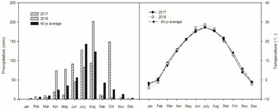 Monthly precipitation totals and temperature averages for 2017–2018 and 40-yr average (1980–2019).