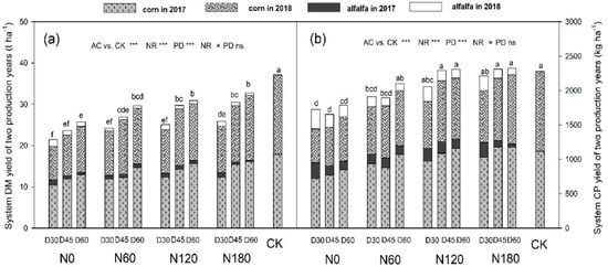 System total dry matter (DM) yield (a) and crude protein (CP) yield (b) of alfalfa–silage corn relay intercropping (AC) and silage corn monoculture control (CK) as affected by nitrogen application rate (NR) and corn plant density (PD). N0, N60, N120 and N180 mean N application rate of 0, 60, 120 and 180 kg N ha−1. D30, D45 and D60 mean corn seeding rate of 30, 45 and 60 thousand plants ha−1. Different letters indicate significant differences at the level of p < 0.05. *** indicates significant difference at p < 0.001; ns indicates not significant at p < 0.05.