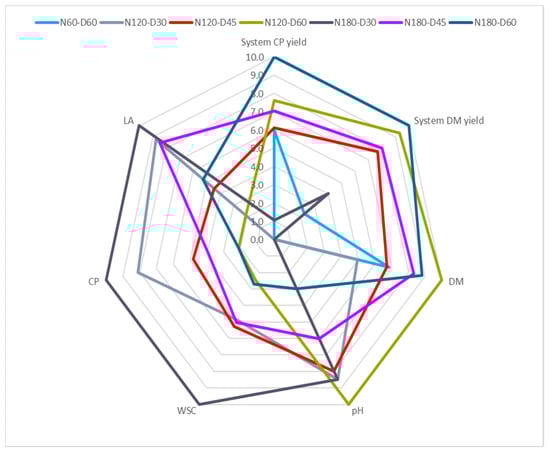 Multicriteria assessment of treatment combinations in alfalfa–silage corn relay intercropping system. A 2-yr system total dry matter (DM) yield, 2-yr system crude protein (CP) yield, and 2-yr average DM content, 2-yr average CP content, 2-yr average pH, 2-yr average lactic acid (LA) concentration and 2-yr average water soluble carbohydrate (WSC) of silage transformed to 0 to 10 scores, 0 being the worst score and 10 the best score. N60, N120 and N180 mean N application rate of 60, 120 and 180 kg N ha−1. D30, D45 and D60 mean corn seeding rate of 30, 45 and 60 thousand plants ha−1.