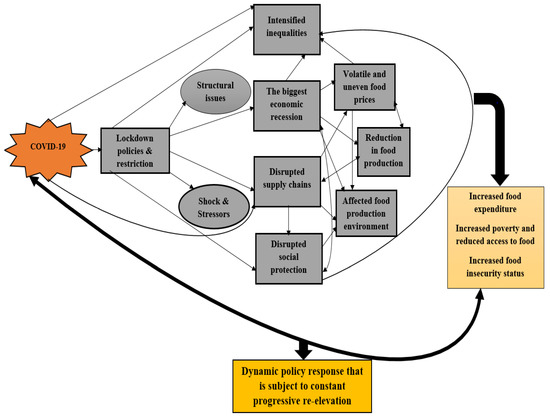 As with other nations, a number of overlapping and reinforcing dynamics have emerged that have influenced food systems and food security in Nigeria, including altering food supply chains, thereby disrupting social protection programmes, losing income and livelihoods, altering food environments, and increasing food prices [71,72,73]. Other challenges to food security in Nigeria are recurrent drought, traditional agricultural practices, unstable weather, pests and diseases, weak institutional capacity, population pressure, as well as inadequate infrastructures and social services. Moreover, food insecurity is one of the defining features of rural poverty, affecting millions of people, specifically in rural areas [70]. Given the high degree of uncertainty surrounding the coronavirus, and its evolution and resolution, there is and may be future threats to food production and prices as well as food security in Nigeria. Figure 1 gives a brief overview of these dynamics and the policy’s needs and the pandemic’s effects having been shown in diver’s ways in Nigeria as it has unfolded.