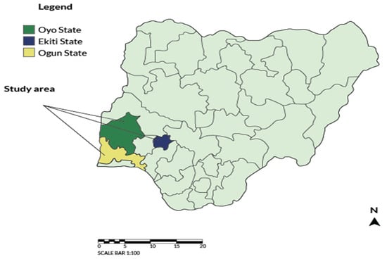 This study was conducted in the rural SouthWestern geopolitical zone of Nigeria (Figure 2) [74,75], which consists of six states, namely: Ekiti, Lagos, Osun, Ogun, Ondo, and Oyo, and from which three were randomly selected. The major occupation is farming, in which maize, cassava, yam, oil palm, cocoa and timber are equally produced comercially. Most rural families in the zone survive on subsistence farming, with supplementary income from employment outside the home, which was adversely disrupted by the COVID-19 pandemic restrictions and regulation, as people were required to stay at home for long periods. This resulted in rural households dropping into increasingly poor categories, resulting in the majority having to depend on savings and help from relatives. The natural vegetation consists of rain forest in the south and Guinea savannah in the north, with the soil being fertile enough for subsistence farming activities.