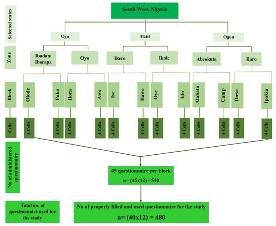 A multi-stage sampling procedure was applied to select 480 rural farming households using primary data from structured interviews across three (Oyo, Ekiti and Ogun) of the six states that made up SouthWestern Nigeria (Figure 3). A multi-stage sampling procedure was used due to the fact that the sampling population is so vast, whereby reaching every individual is impossible. Likewise, it is a cost and time effective sampling procedure which helps to slim down the population into a smaller group. The data were collected across the study locations in the year 2020. In the first stage of the multi-stage sampling, three states were selected due to the extent of their small-scale farming activities, prominence of poverty among the rural inhabitants, and scarcity of data on rural farming households COVID-19 implications on food security. The states consist of a number of sub-administrative delineations, these being zones, blocks and cells, which were used in this study.